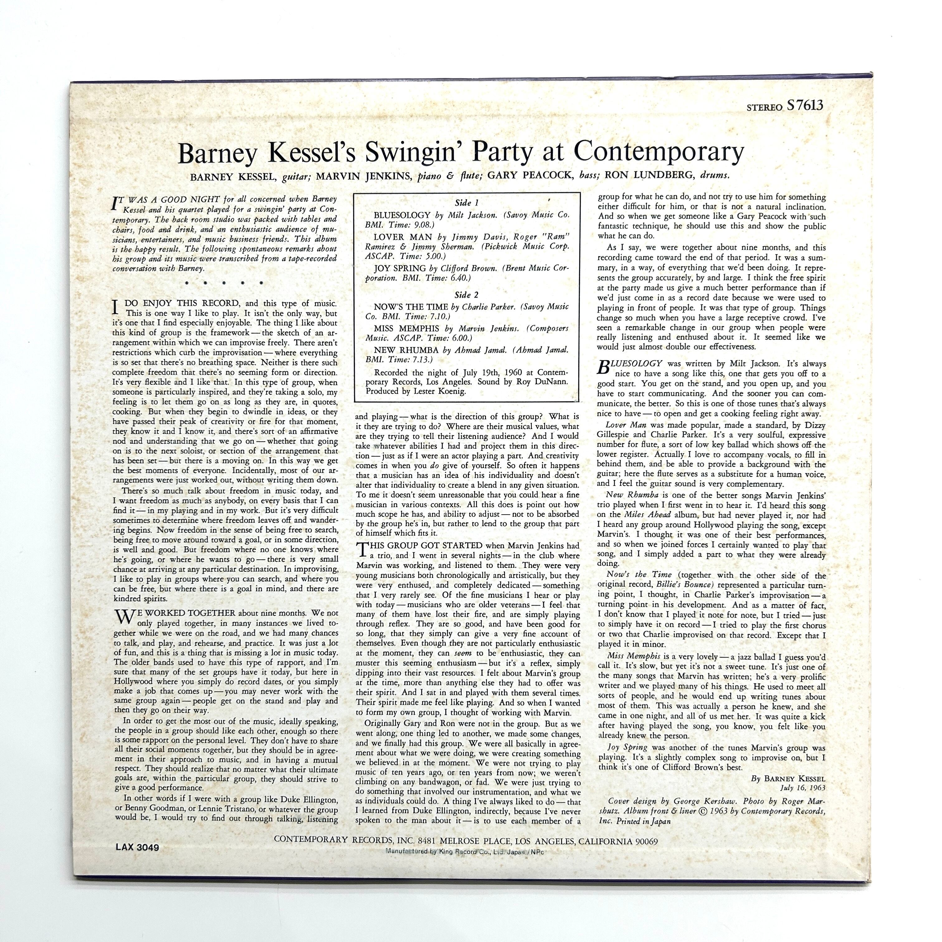 BARNEY KESSELはオクラホマ出身のクールジャズギタリストで、1960年録音/1963年リリースの〈SWINGIN’ PARTY〉を発表。スタジオながらライブ感ある演奏とGARY PEACOCK初参加が光る 。