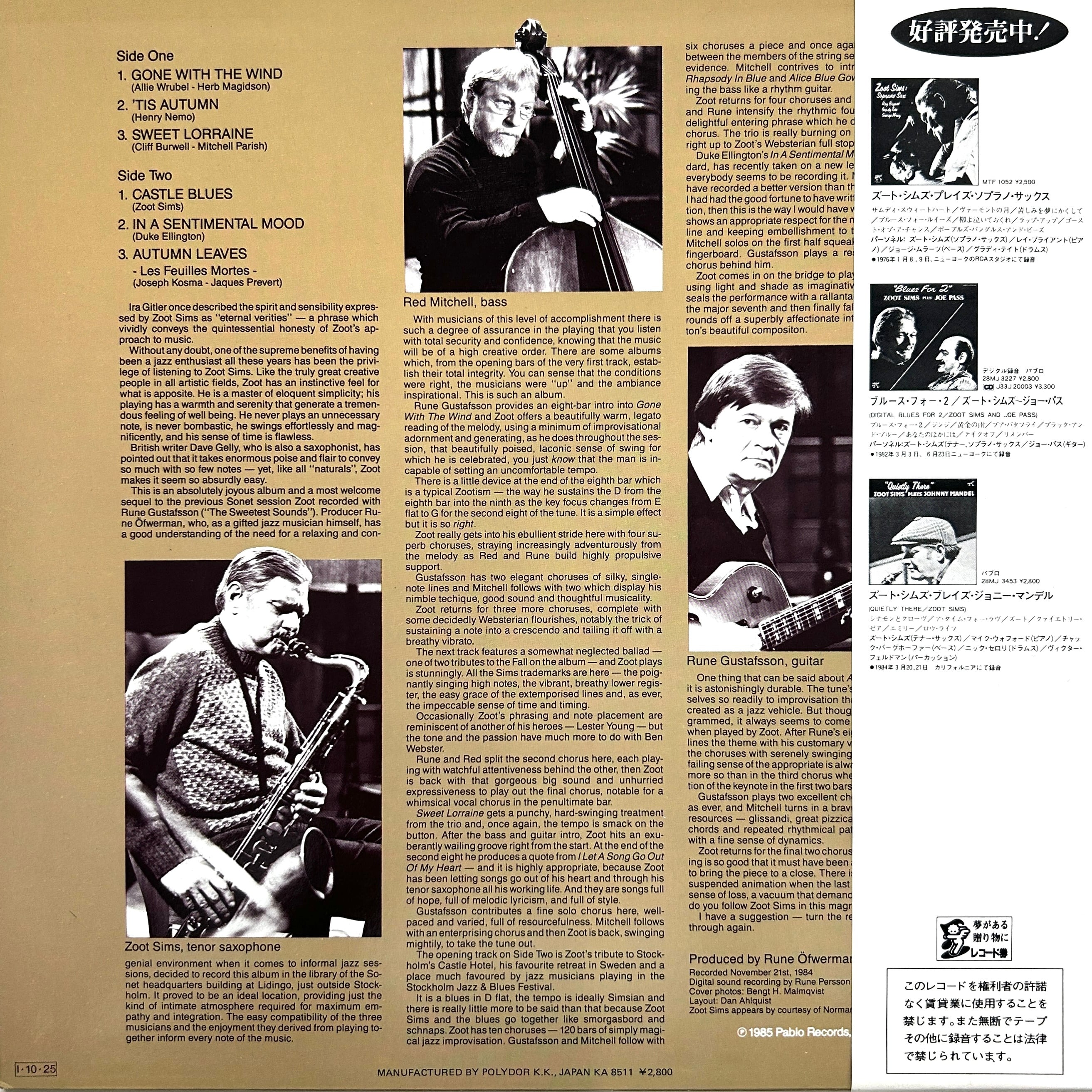 カリフォルニア出身のテナーサックスZOOT SIMS。ニューヨーク生まれのベーシストRED MITCHELL、スウェーデン出身のギタリストRUNE GUSTAFSSON と組んだドラムなしトリオ作。