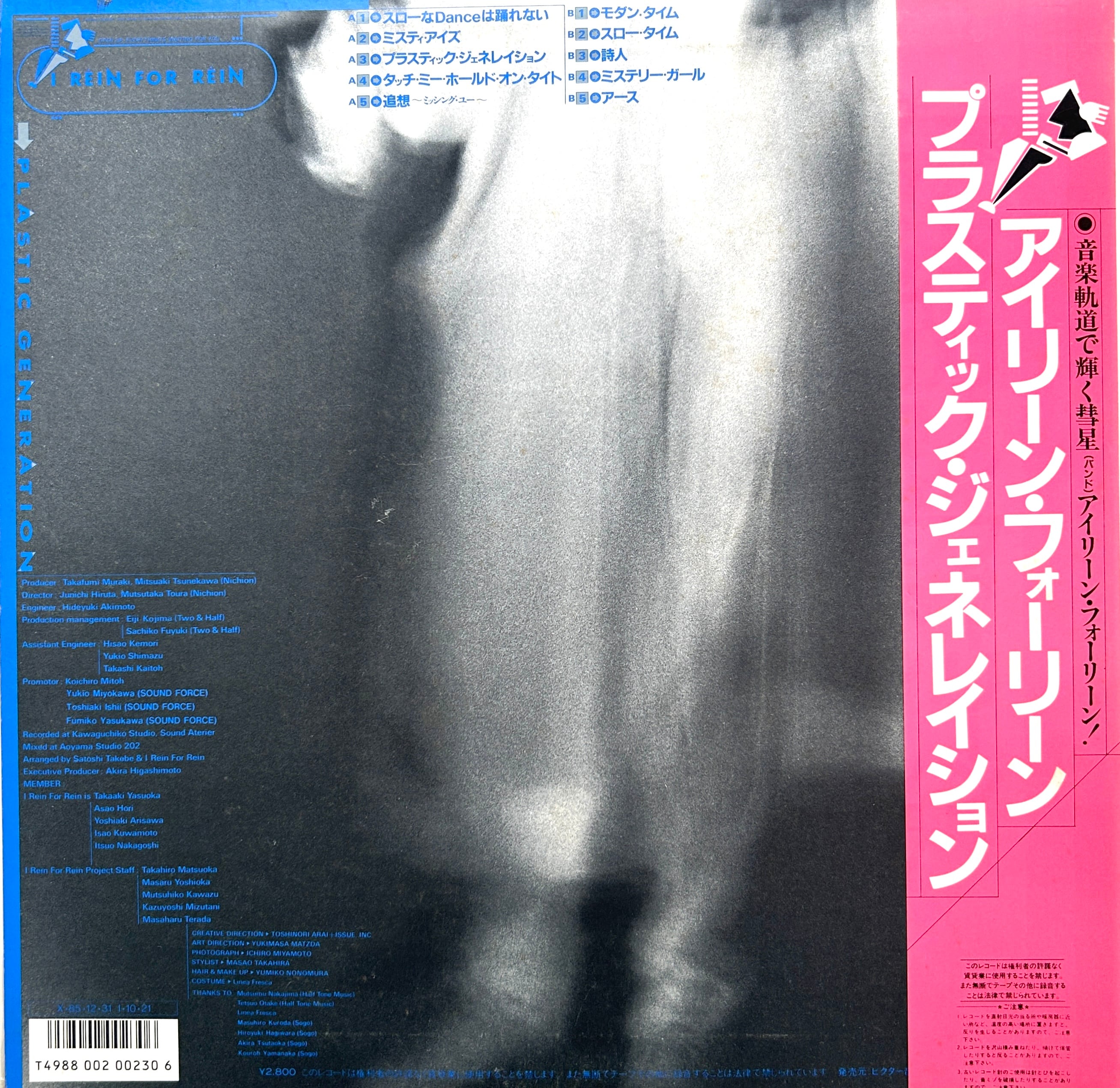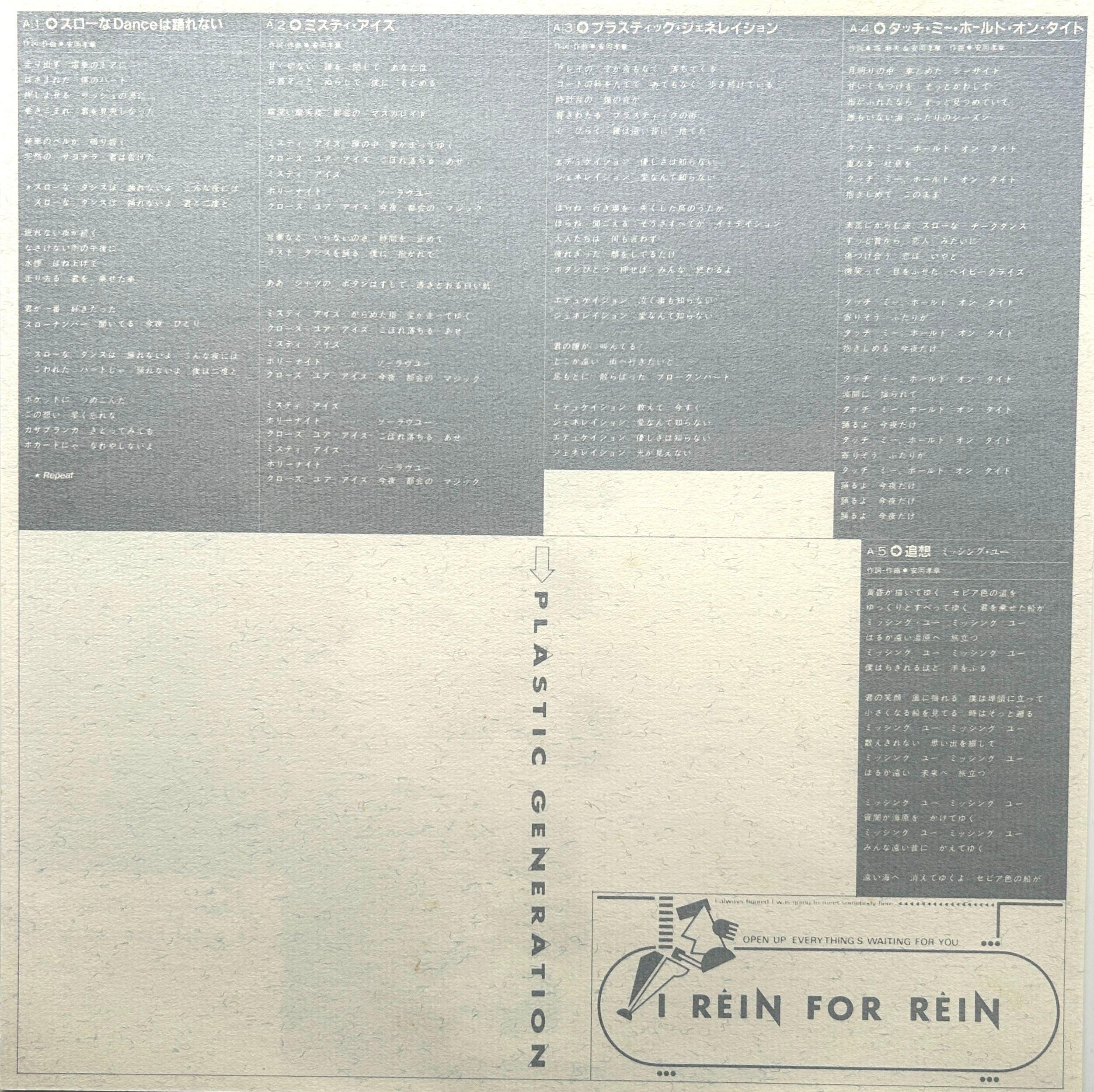 高知県出身バンドI REIN FOR REINのデビューアルバム〈PLASTIC GENERATION〉。軽いビートにキラっとしたシンセ、素直なメロディが合わさっていて、いわゆる都会派シティポップというより、地方バンドが全力で80年代のかっこよさを取りにいった感じがまっすぐ伝わる。
