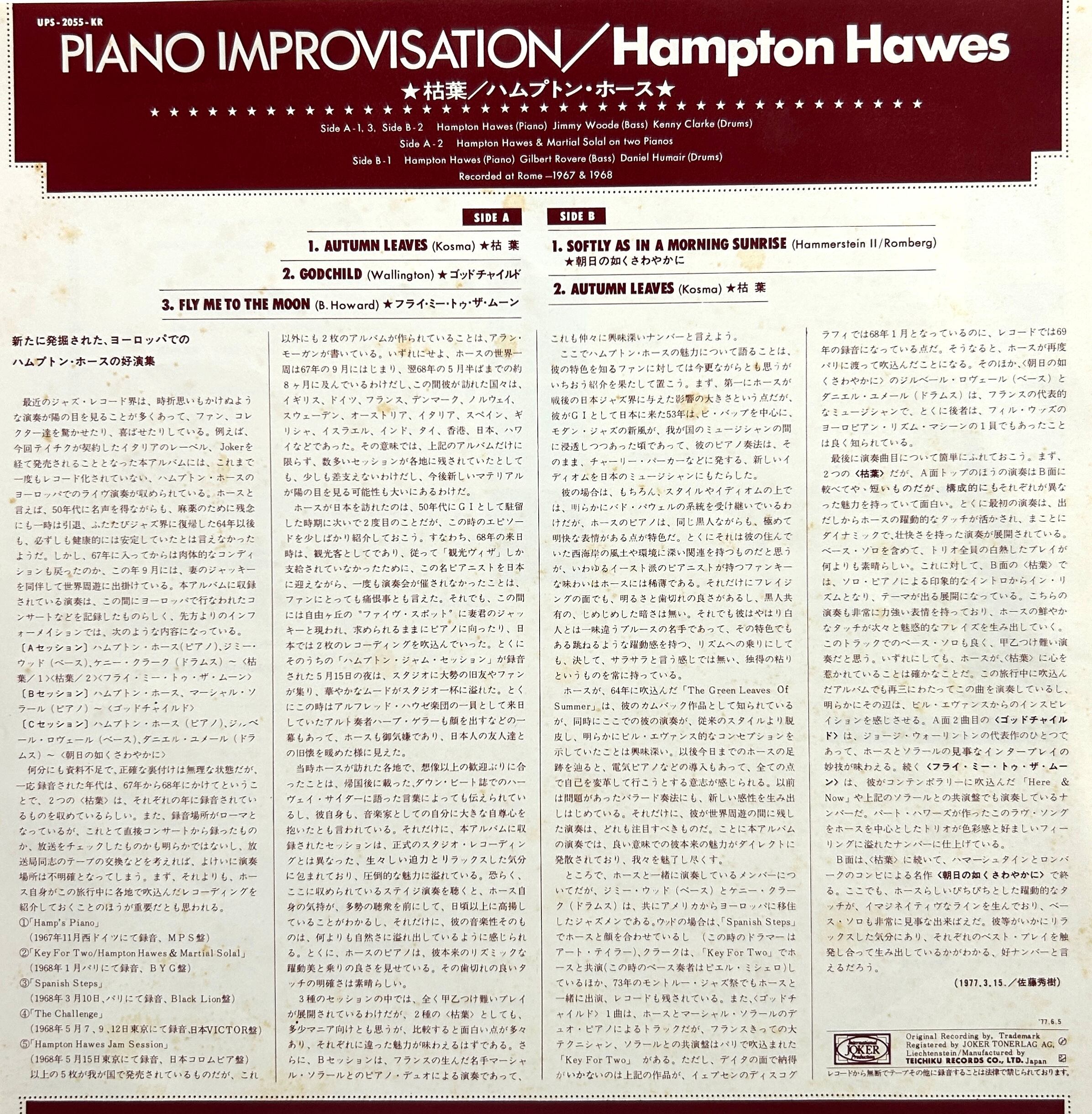 西海岸ピアノの名手HAMPTON HAWESのソロ即興サイドに焦点を当てた日本企画盤〈PIANO IMPROVISATION〉。シリーズはGREAT ART OF JAZZの流れに位置づけられる1枚で、リリースは1977年の日本盤。