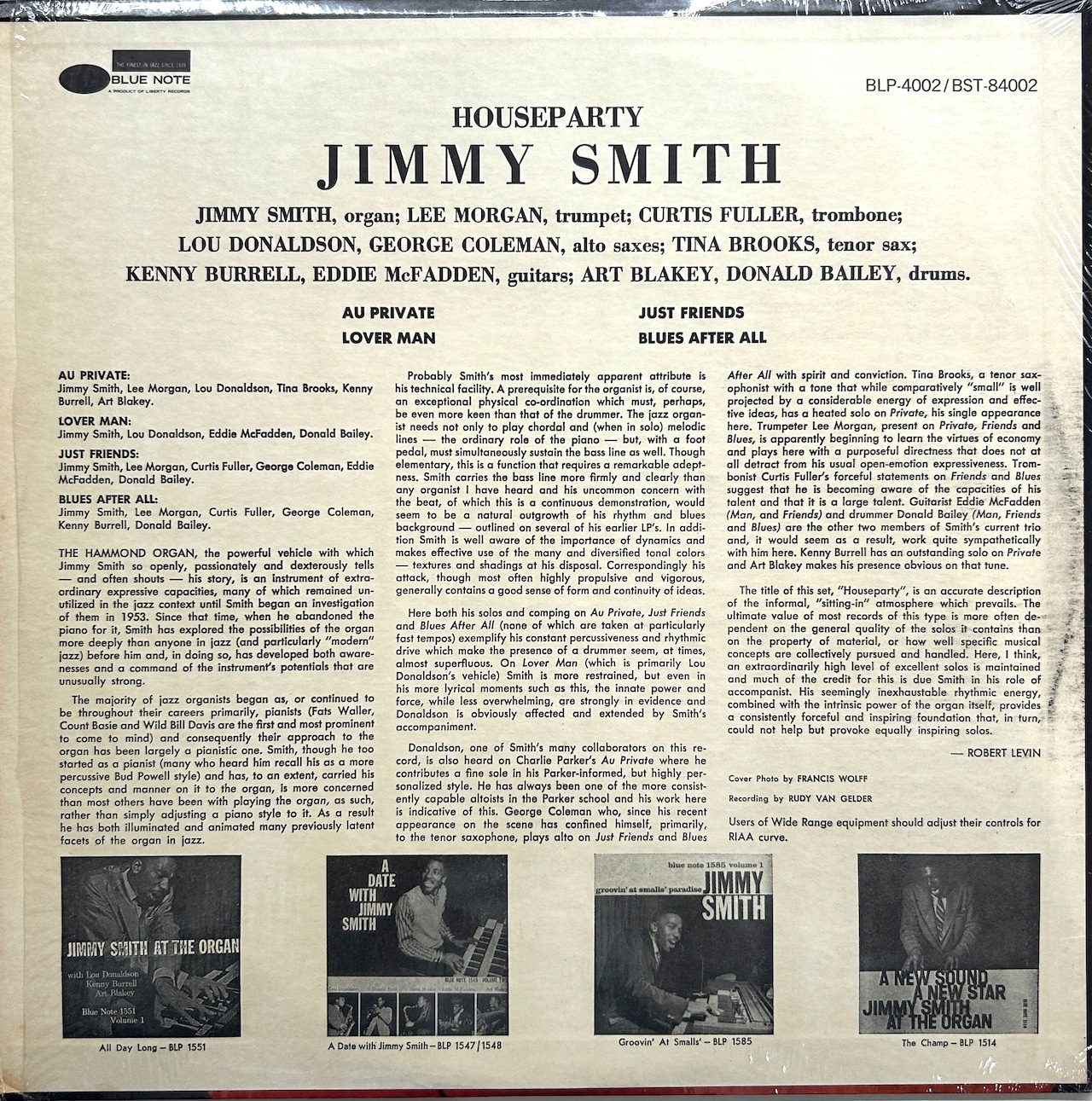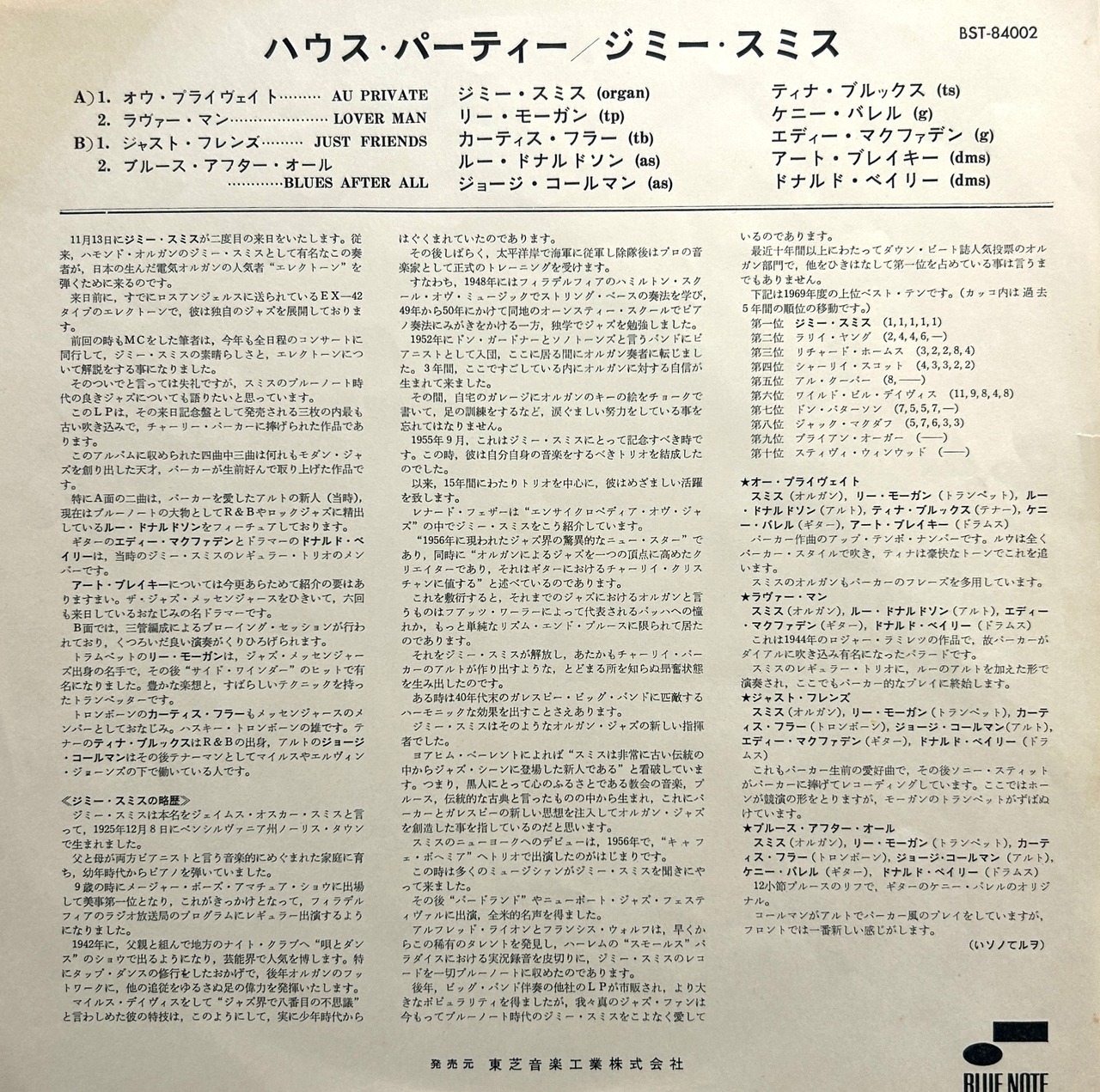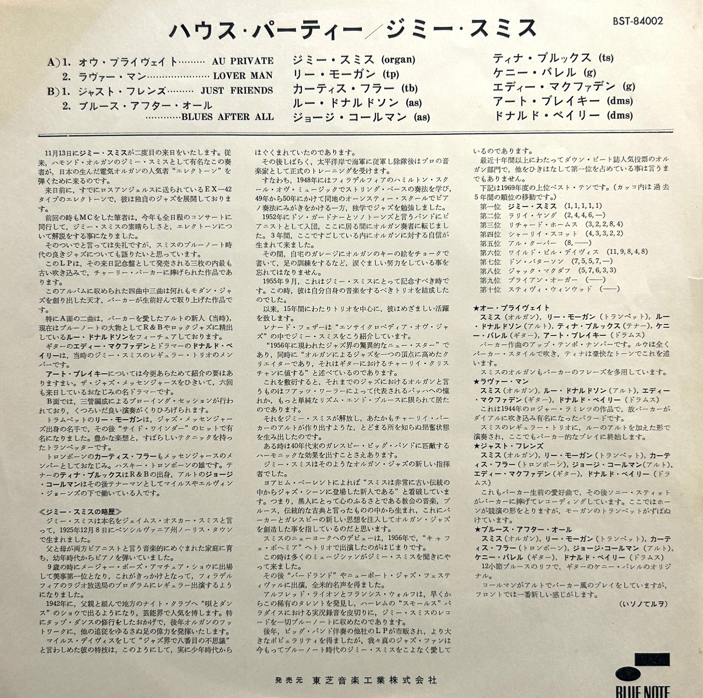 オルガン奏者JIMMY SMITHの看板作〈HOUSE PARTY〉。1957年と1958年のマンハッタン録音で、LEE MORGAN、CURTIS FULLER、LOU DONALDSON、KENNY BURRELL、ART BLAKEYらが絡む豪華ジャム色の強い内容。